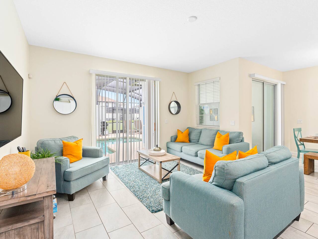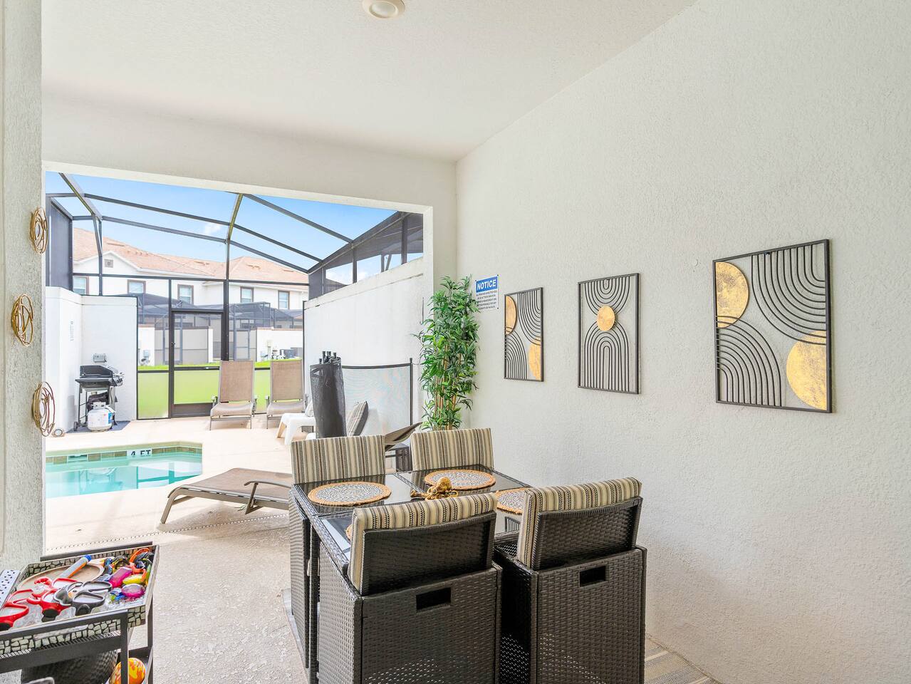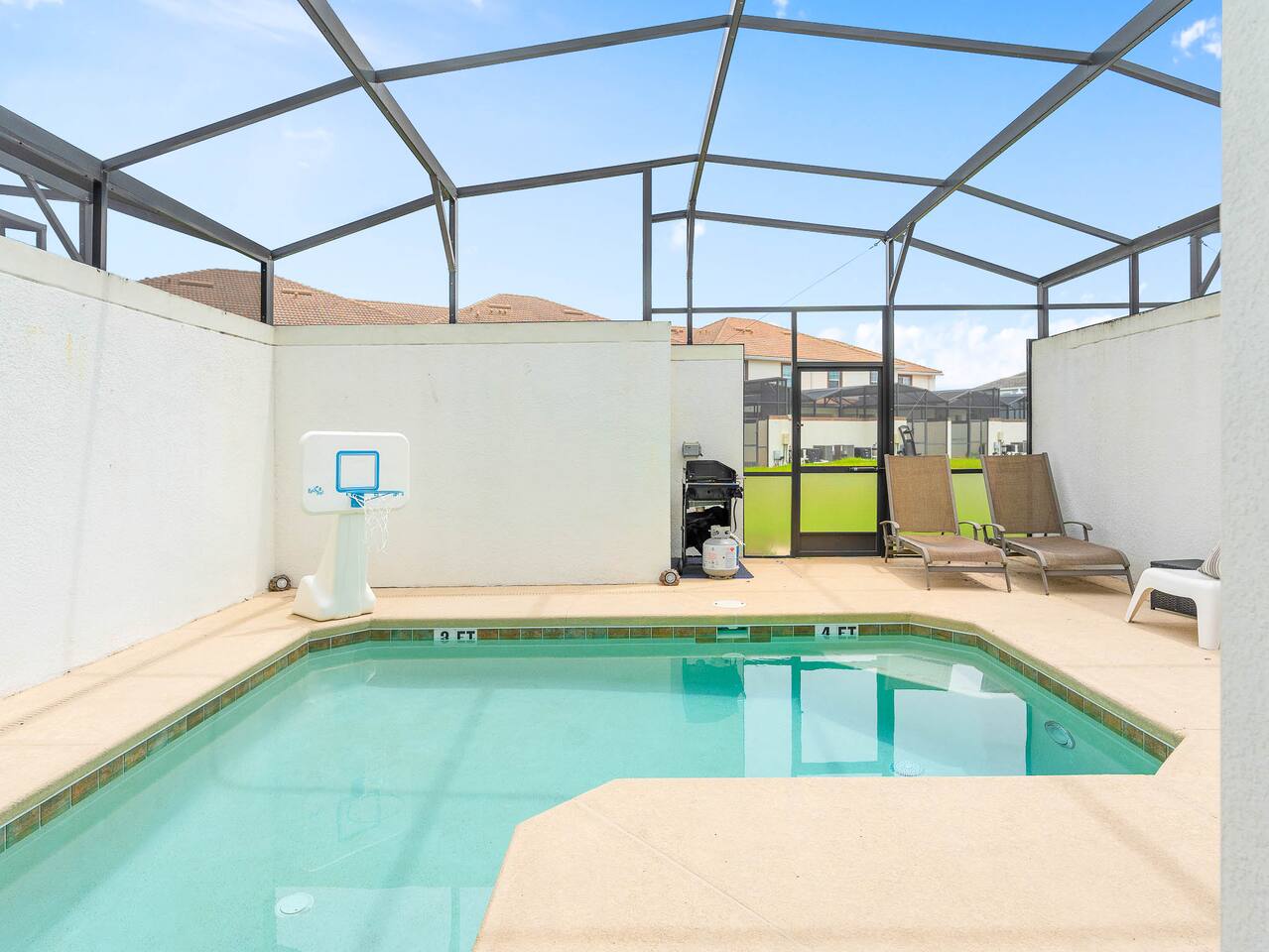 You'll never forget your trip to Disney! Let us help you make it memorable with a nice, comfy stay and incredible amenities. Centrally located to restaurants and shopping, walkable to the clubhouse amenity area, and a short drive to Disney World or Universal Studios. QUICK HITS - Easy self check-in - Child safety pool fence - Private screened patio with heated pool and hot tub (small fee for heating, message me) - Indoor/outdoor dining - BBQ Grill available for small fee (for your entire stay, not per day) FREE on-site waterpark. Just go to the clubhouse and show them your reservation with us on your phone and they will set you up with access. RESORT AMENITIES (Included, just a 10 min walk away) - Huge community pools - Water jungle gym - Waterslides - Lazy River - Tiki Bar - On-site restaurant - Theater - Arcade - Sport Courts TRAVEL LIGHT, we provide the following baby gear for you to use - Pack 'n Play - High chair - Umbrella stroller Villa has outdoor ring video doorbell Pets not allowed. Neighborhood enforced outdoor quiet hours 10pm - 7am. Home is in a gated resort community.
