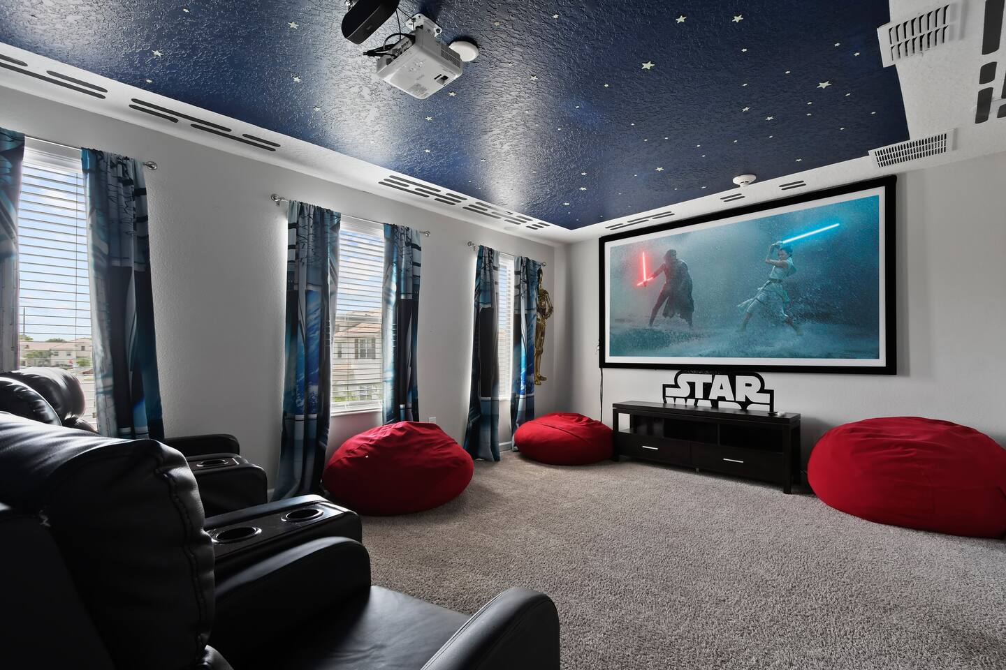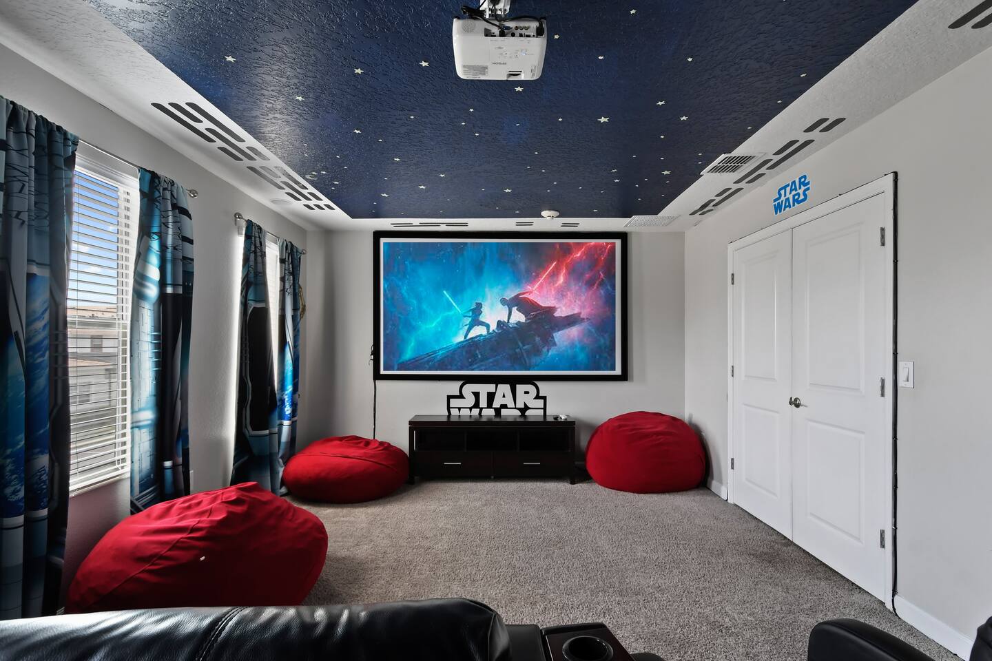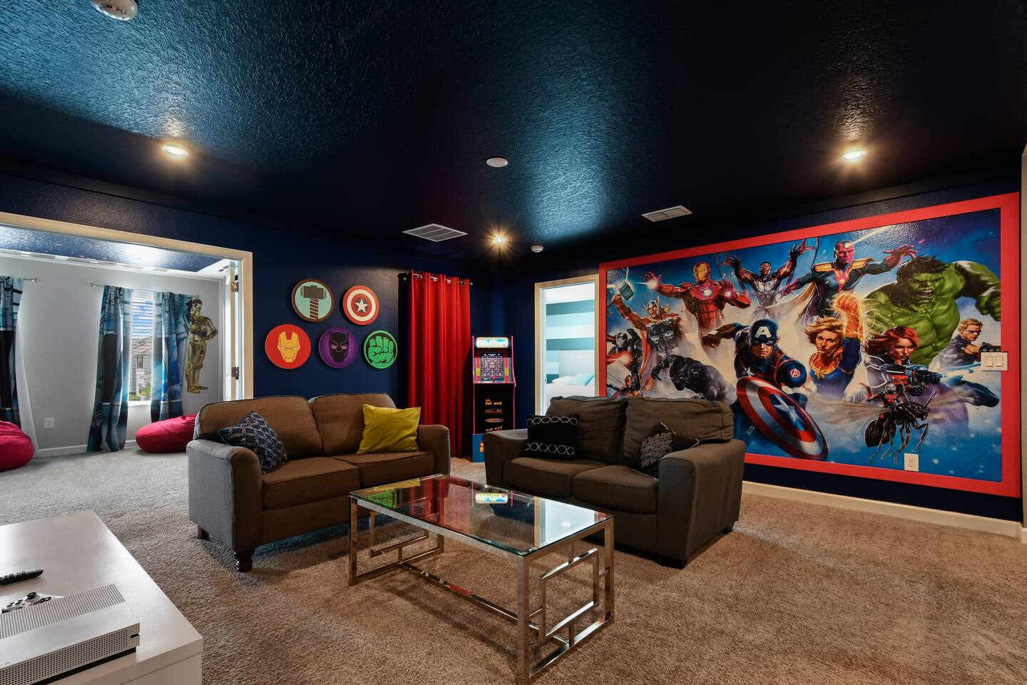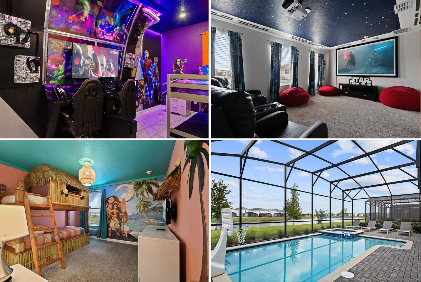 Jordan and Shelby Beck's home is the perfect home base for visiting Disney and Universal! This 9br/5ba Storey Lake home sleeps 28 comfortably. The fun never ends! Relax in the private pool/spa with lake view or let the fun continue in the home theater with 100in projection screen, the Guardians of the Galaxy theme room, the Moana Theme room, and of course, arcade games!