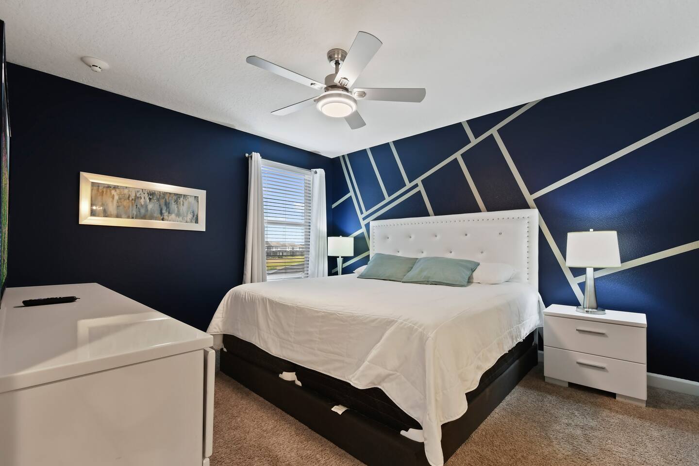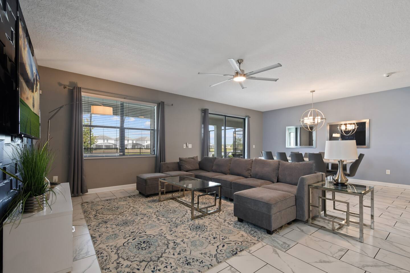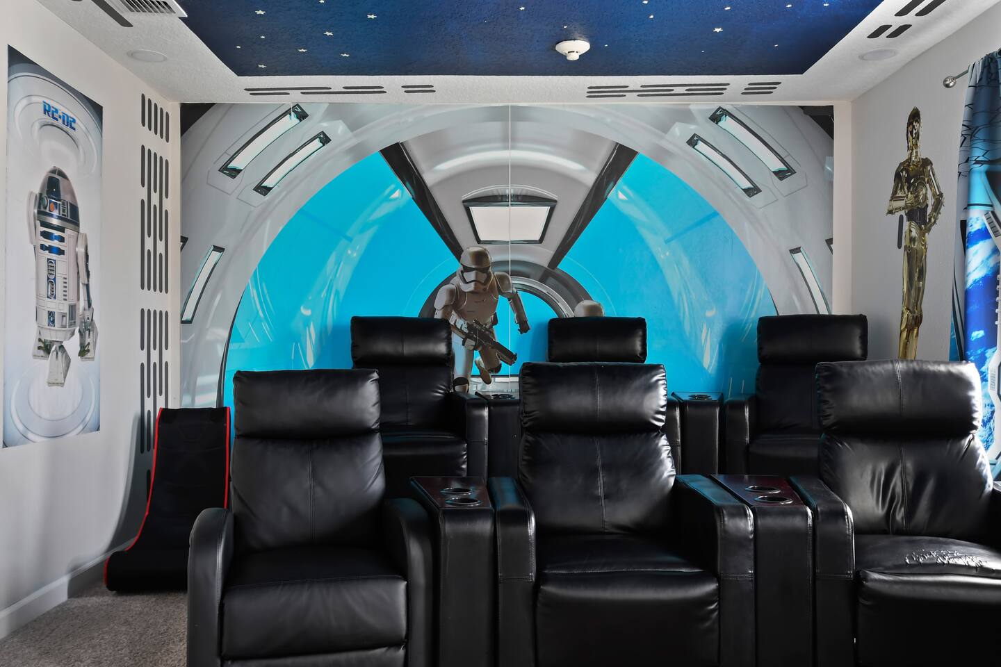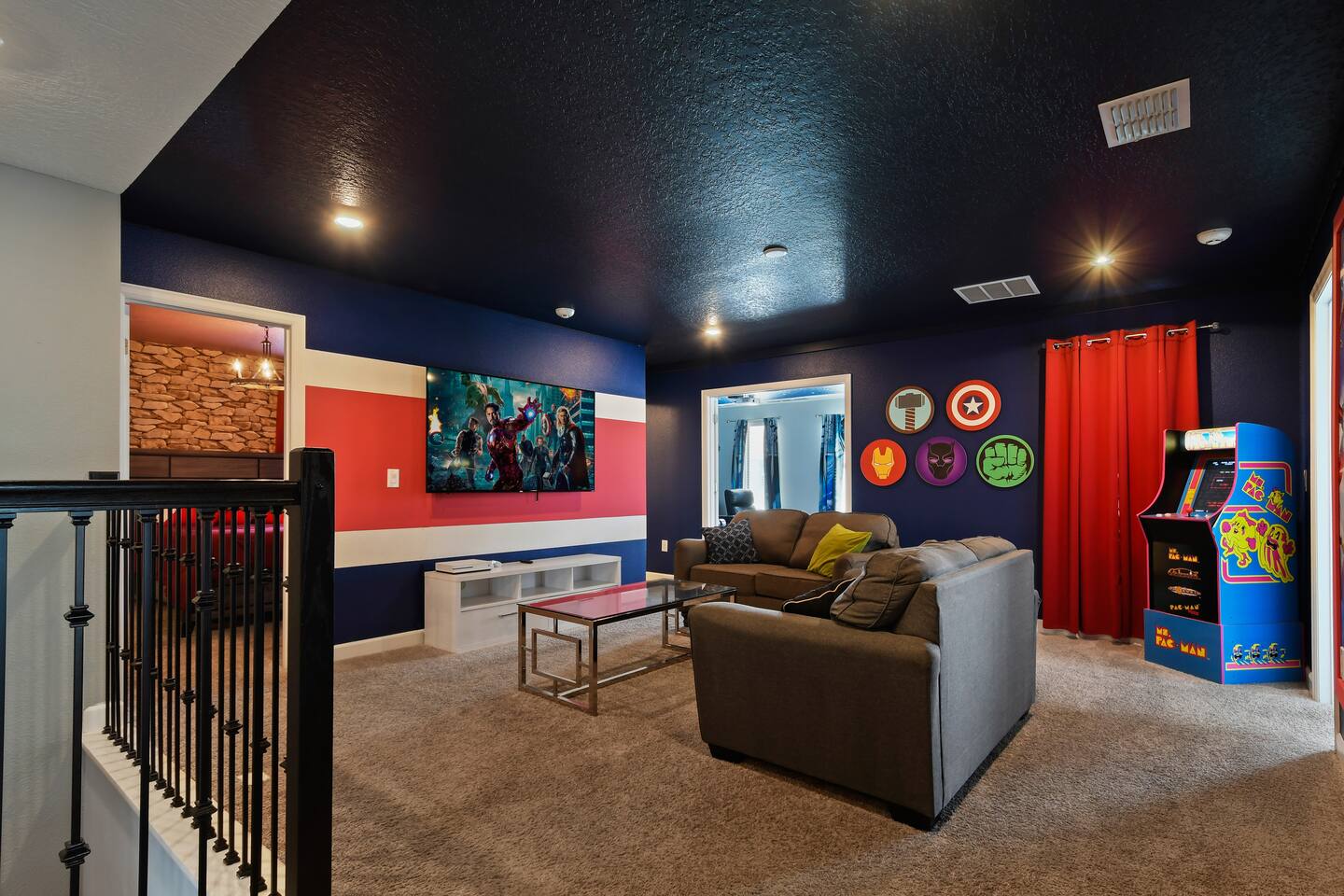 Jordan and Shelby Beck's home is the perfect home base for visiting Disney and Universal! This 9br/5ba Storey Lake home sleeps 28 comfortably. The fun never ends! Relax in the private pool/spa with lake view or let the fun continue in the home theater with 100in projection screen, the Guardians of the Galaxy theme room, the Moana Theme room, and of course, arcade games!