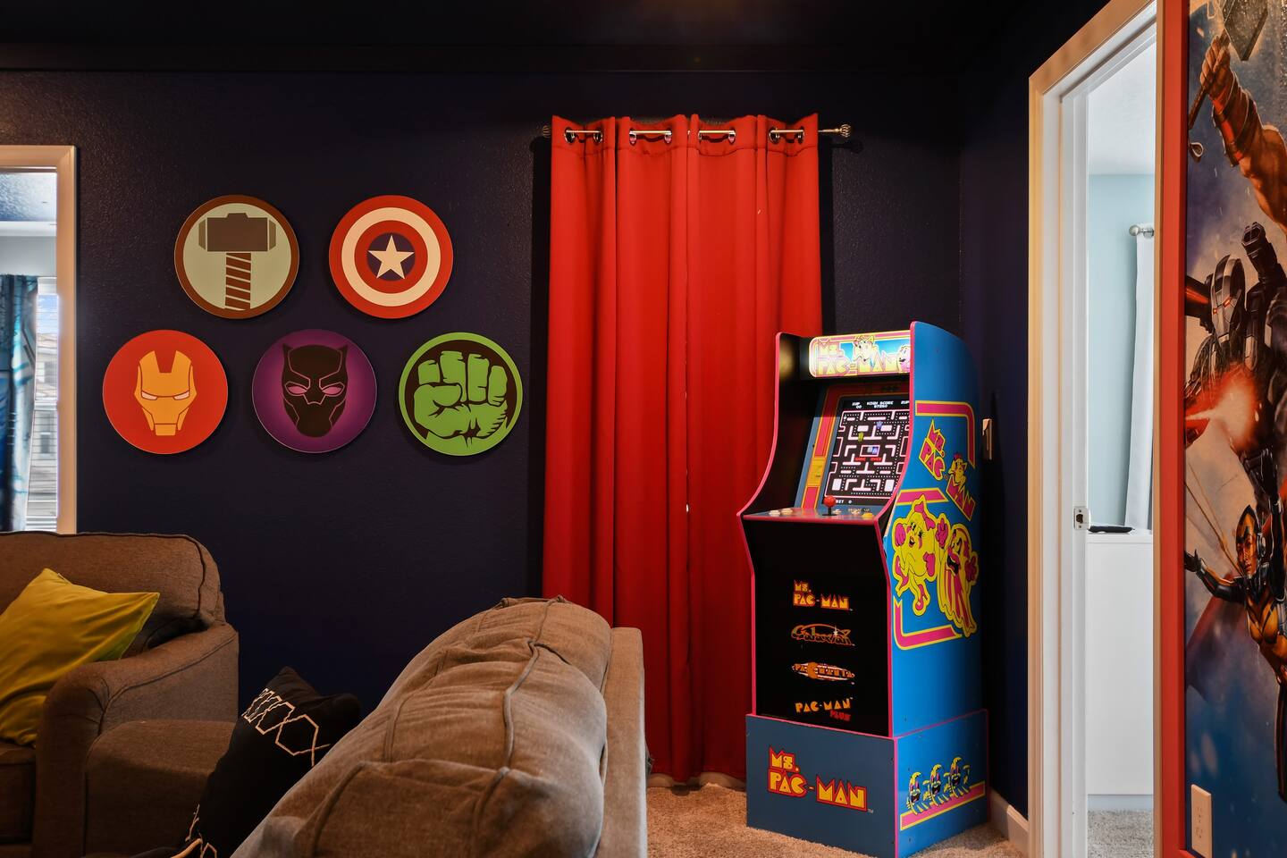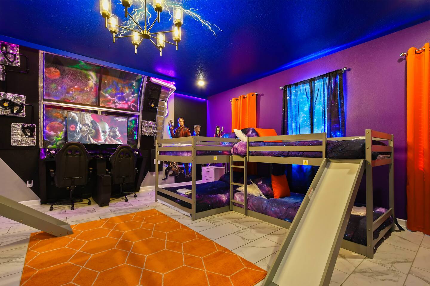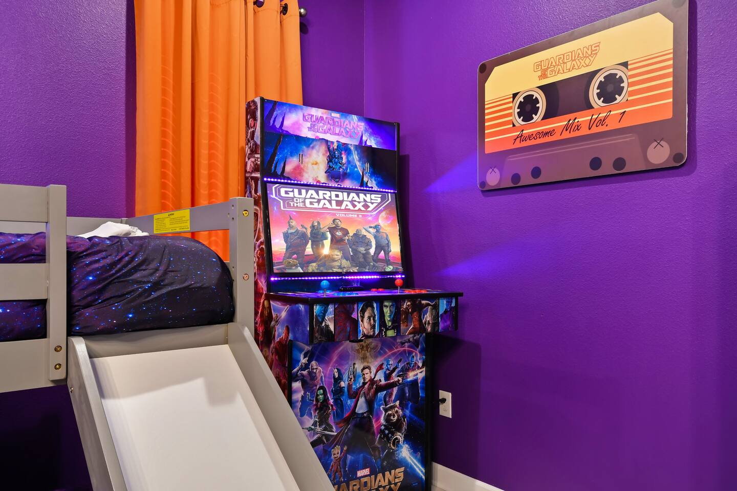 GUARDIANS OF THE GALAXY PLAYROOM The fun doesn't stop at the new Epcot ride. Bring it home in the unique Guardians of the Galaxy game and bedroom complete with arcade rooms and slides. MOANA ROOM Sleep in a magical Tiki Hut and hang with Maui and Moana. HARRY POTTER ROOM The bravest of the bunch are fit to sleep in the Gryffindor common room! LAKEVIEW POOL/SPA Private pool and spa with screened lanai overlook a beautiful lake view. Pool heat is available for $30/day GAMES Arcade games and Xboxes (bring your own login) abound to keep the kiddos entertained while the adults get some much deserved R&R. Or join in on the games yourself! EASY TRAVEL Pack n' Play and High Chair included RESORT ACCESS Your booking includes free access to the Storey Lake Hideaway club, with fun amenities like kayaking, mini-golf, a lazy river, waterslides, and much more! PETS Pets are not allowed Villa has an external video doorbell.