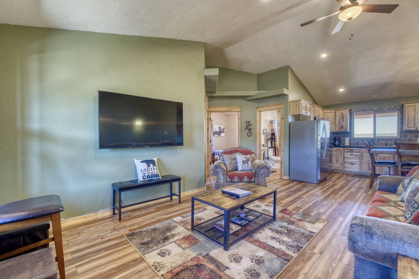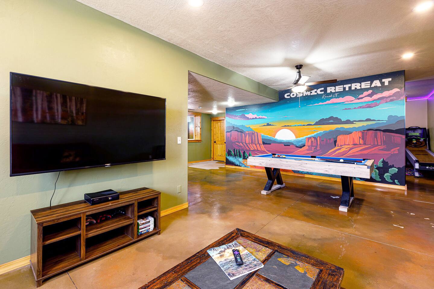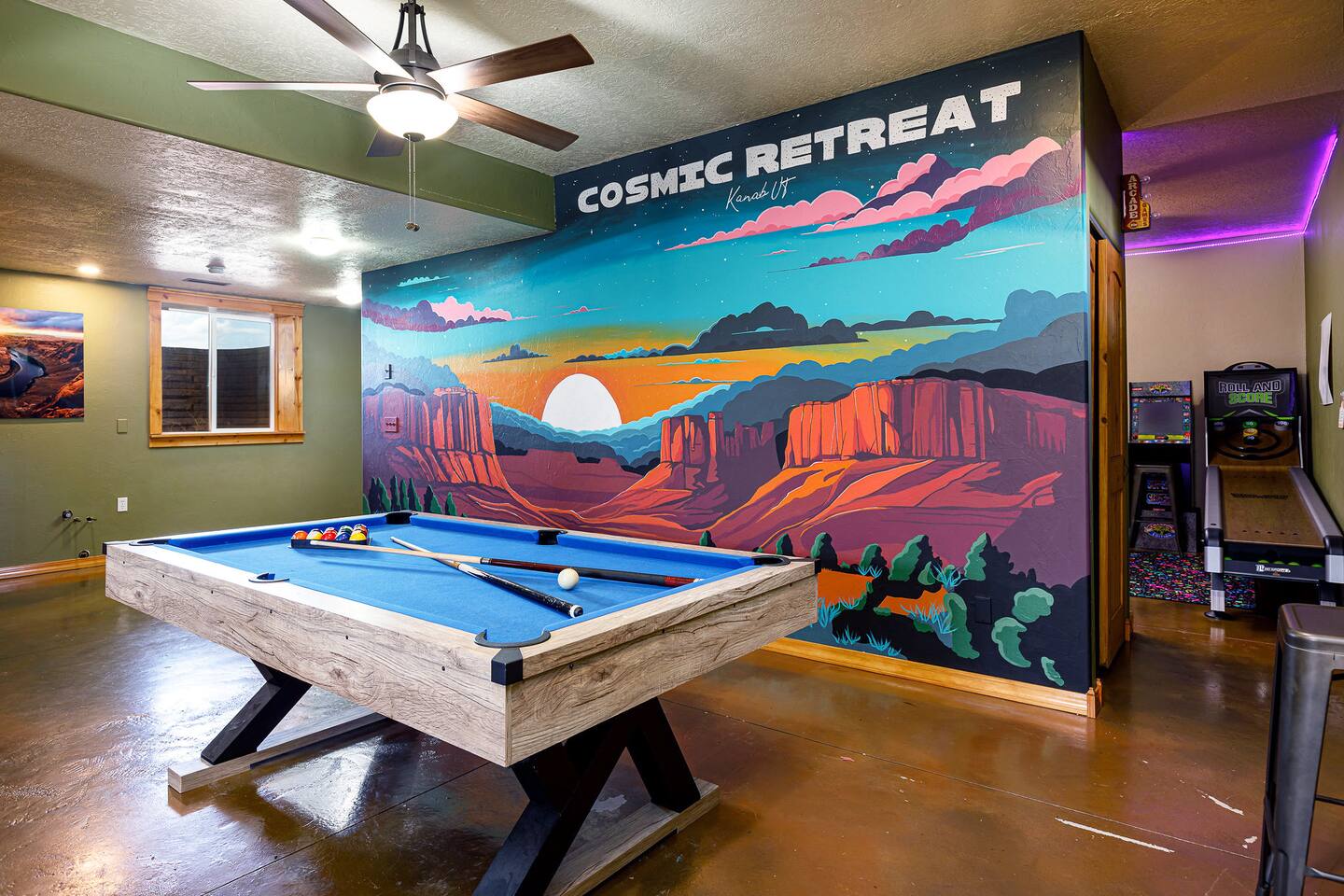 Enjoy world class starry night skies just 7 miles from downtown Kanab. Zion - 1 hr Bryce - 1.5 hrs Grand Canyon North Rim - 1.25 hr Lake Powell/Antelope Canyon/Horseshoe Bend - 1.25 hr Enjoy a hike during the day and then relax at night while the kids play in the arcade or on one of the game consoles. Tastefully decorated with my own Fine Art Photography prints of the area. The property is 3 acres and contains a larger cabin, and a 2br Casita, separated by a garage in between. Please note that garage access is typically not included as we use that for storing cleaning supplies, but arrangements can be made for use if you contact me. Pets are allowed but require an additional $70 fee per pet for cleaning. Please Let me know after booking if you are planning on bringing your pet along! Cabin has an external video doorbell. THE CABINS: Flat-screen Smart TV, hardwood floors, high ceilings, electric fireplace, ceiling fans, washer/dryer, fast WiFi KITCHEN: Fully equipped, blender, dishware and flatware, dishwasher, drip coffee maker, toaster, propane grill, refrigerator, oven, stove, microwave